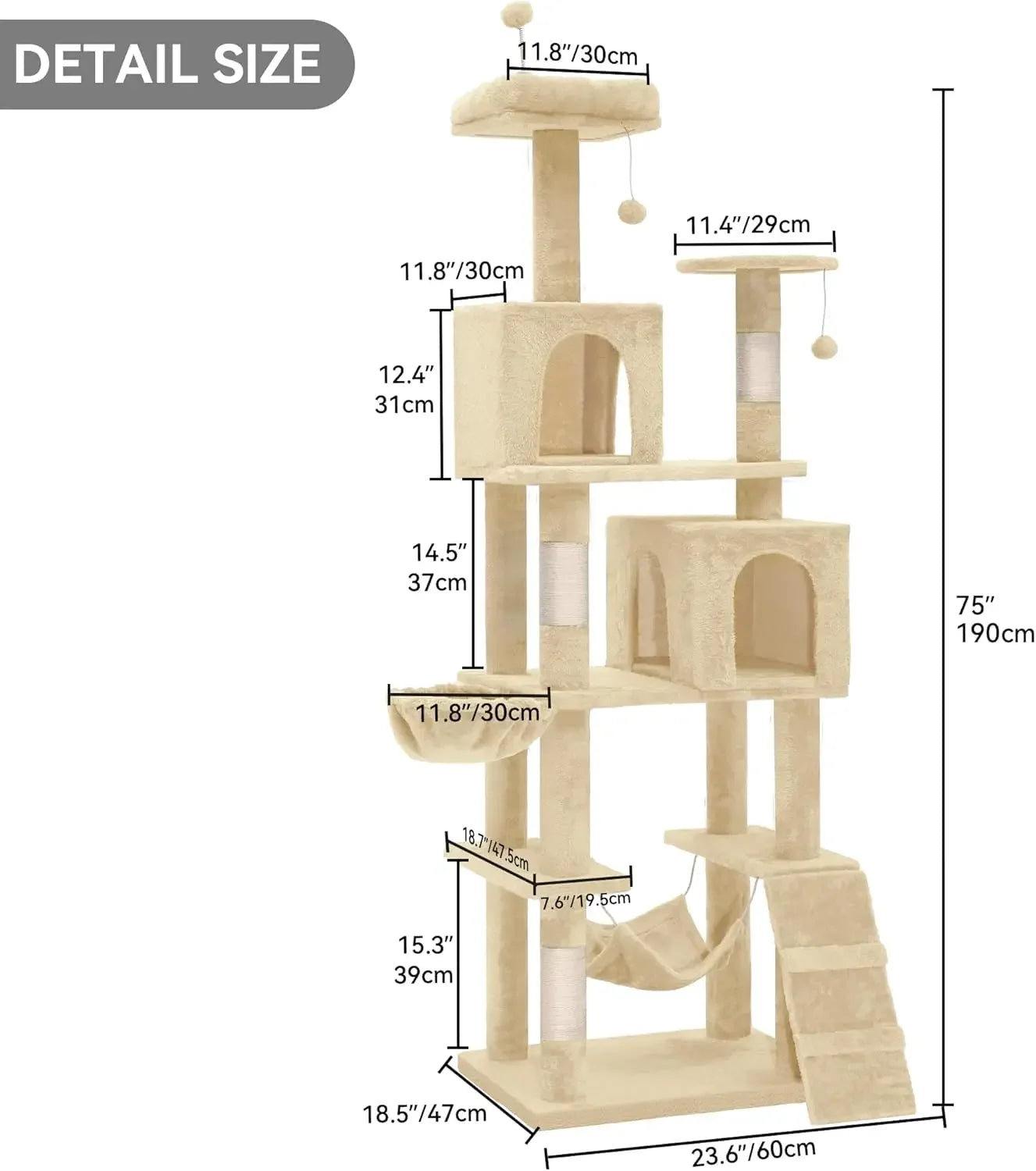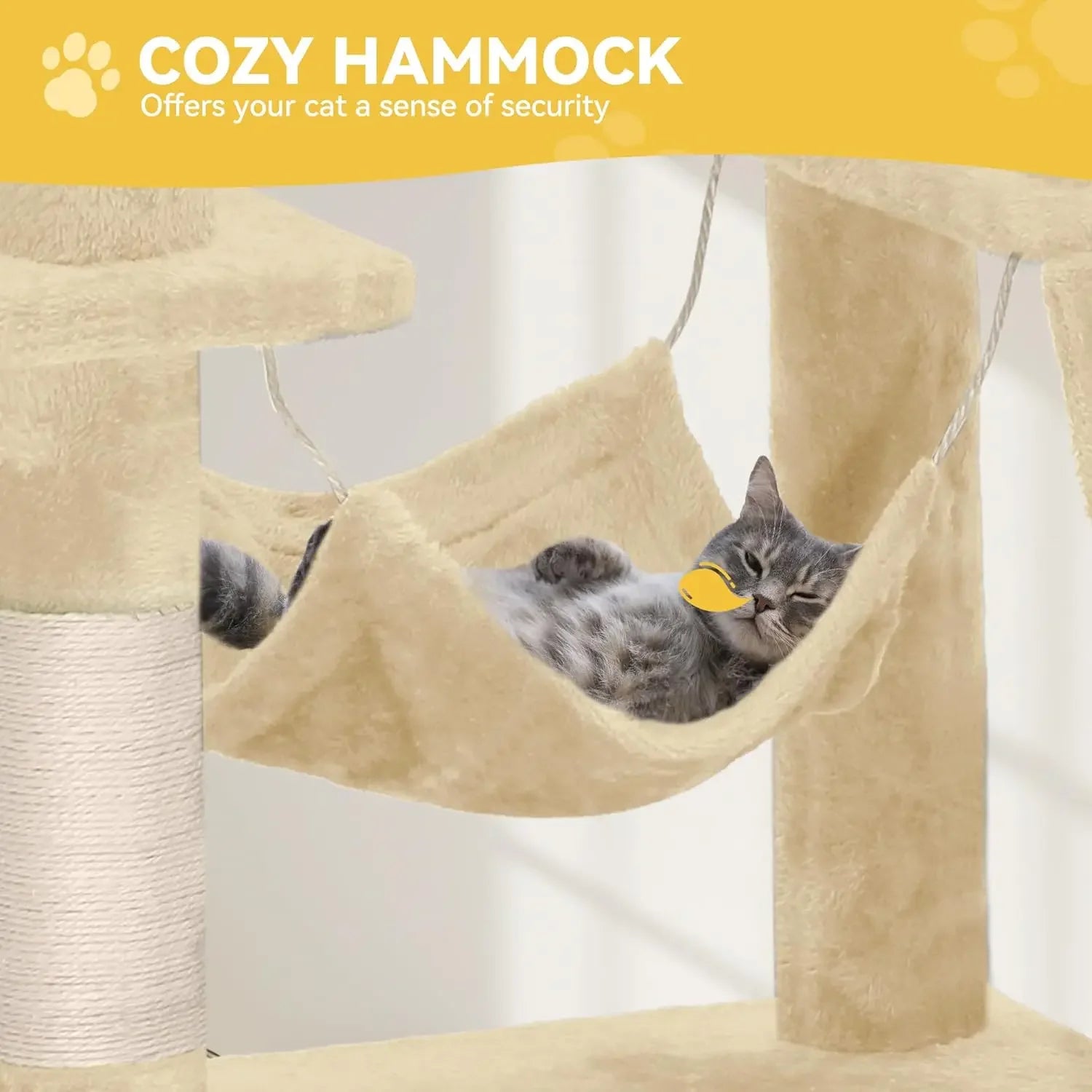 - Playful Lounging Paradise: This all-inclusive cat playground satisfies every feline whim, whether it's playful adventure or leisurely lounging; From snuggling in cozy condos to lounging solo in the basket and hammock, every cat discovers their personal blissful retreat