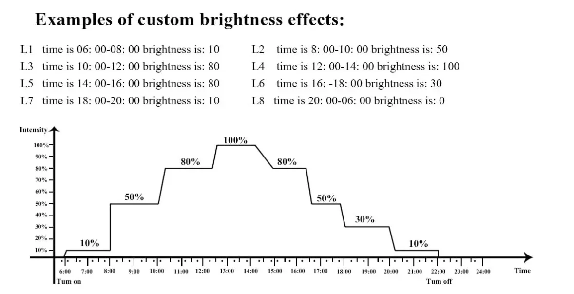 You can set different brightness settings within 8 time periods according to your preference. When this setting is turned on, the two timing functions of DAY-L and MOON-L will be automatically turned off. When this setting is set to OFF, there are two sets of DAY-L and MOON-L. Timing function is turned on automatically.